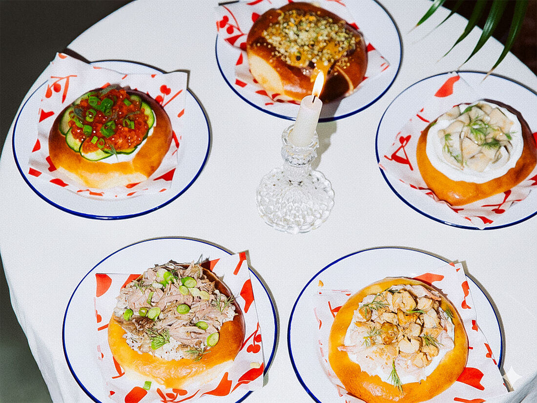 Шаньга с тремя видами икры и малосольными огурцами