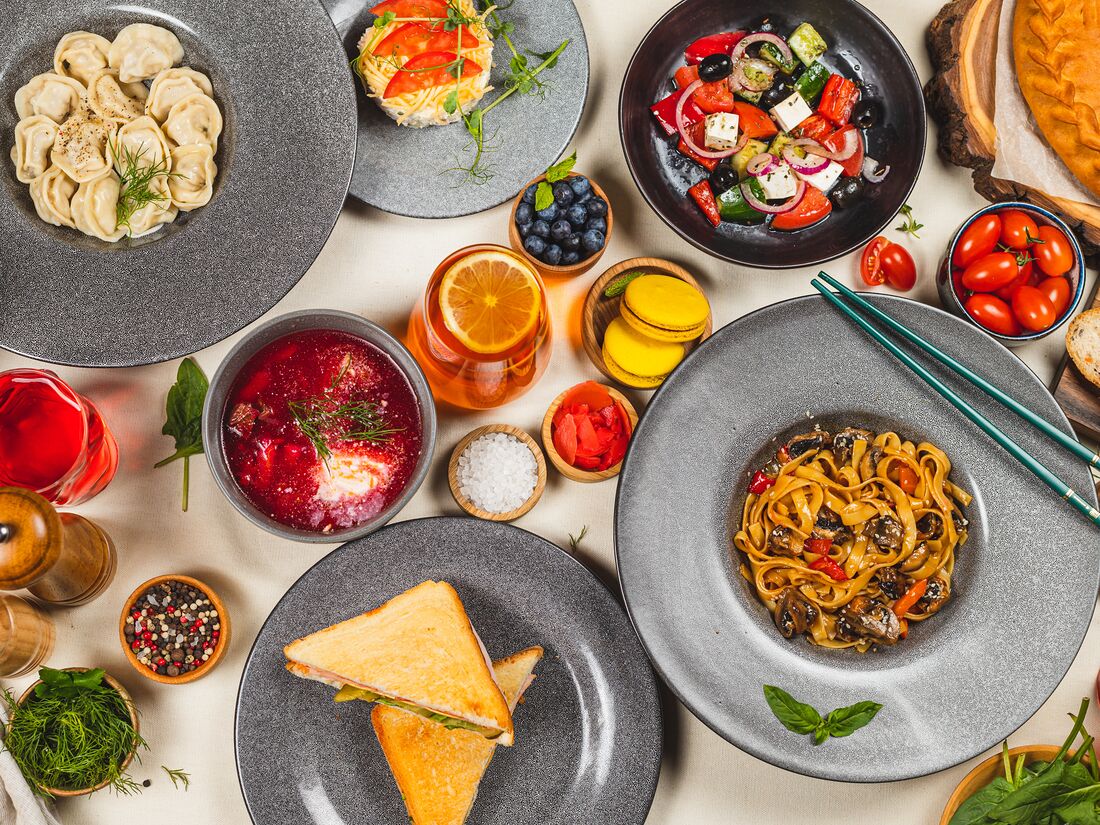 Салат Оливье, пельмени мясные, борщ