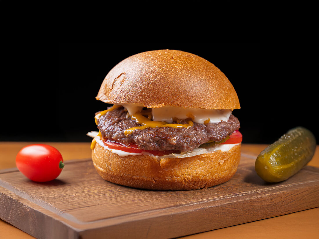 Бургер с котлетой из говядины, беконом и мясным соусом