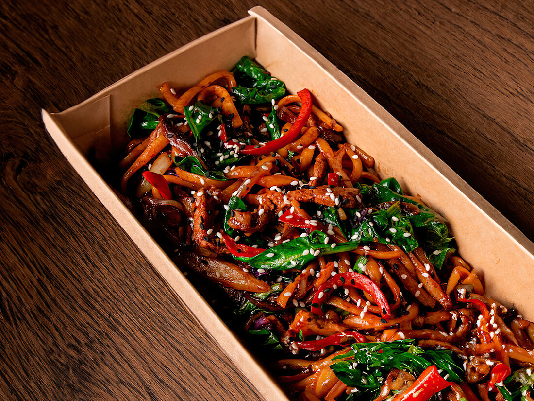 Лапша со свининой в кисло-сладком соусе