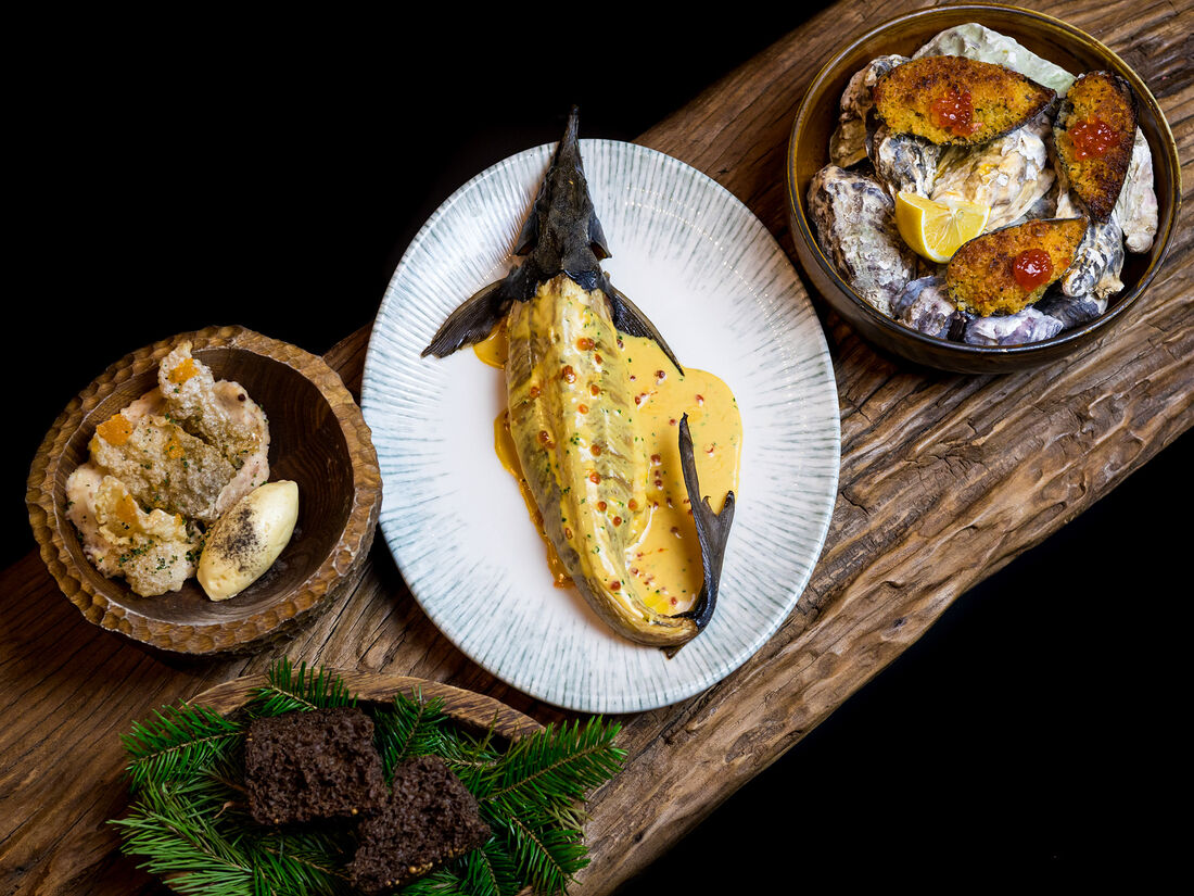 Хариус под шубой с перепелиным яйцом и красной икрой