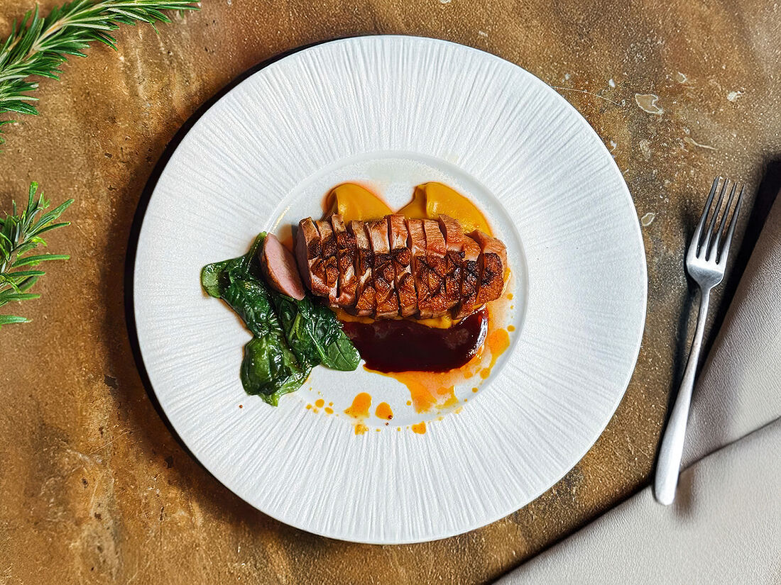 Утиная грудка с кремом из батата и гранатовым соусом