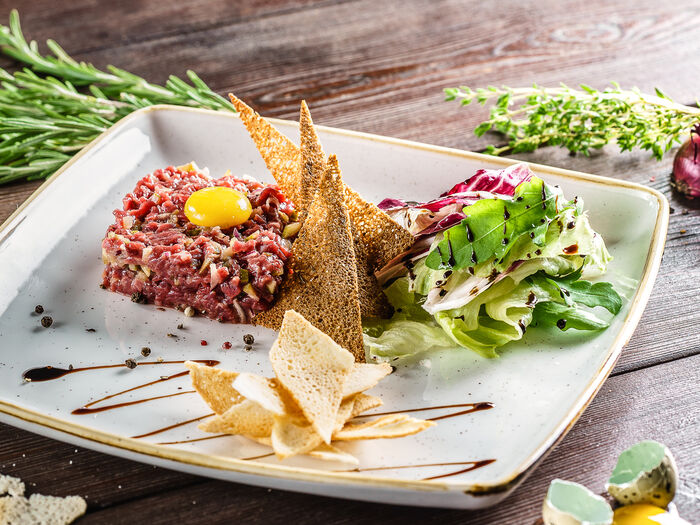 Тартар из говядины с копченой вишней и муссом из желтка
