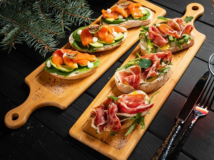 Брускетты с лососем домашнего посола, авокадо и шпинатом