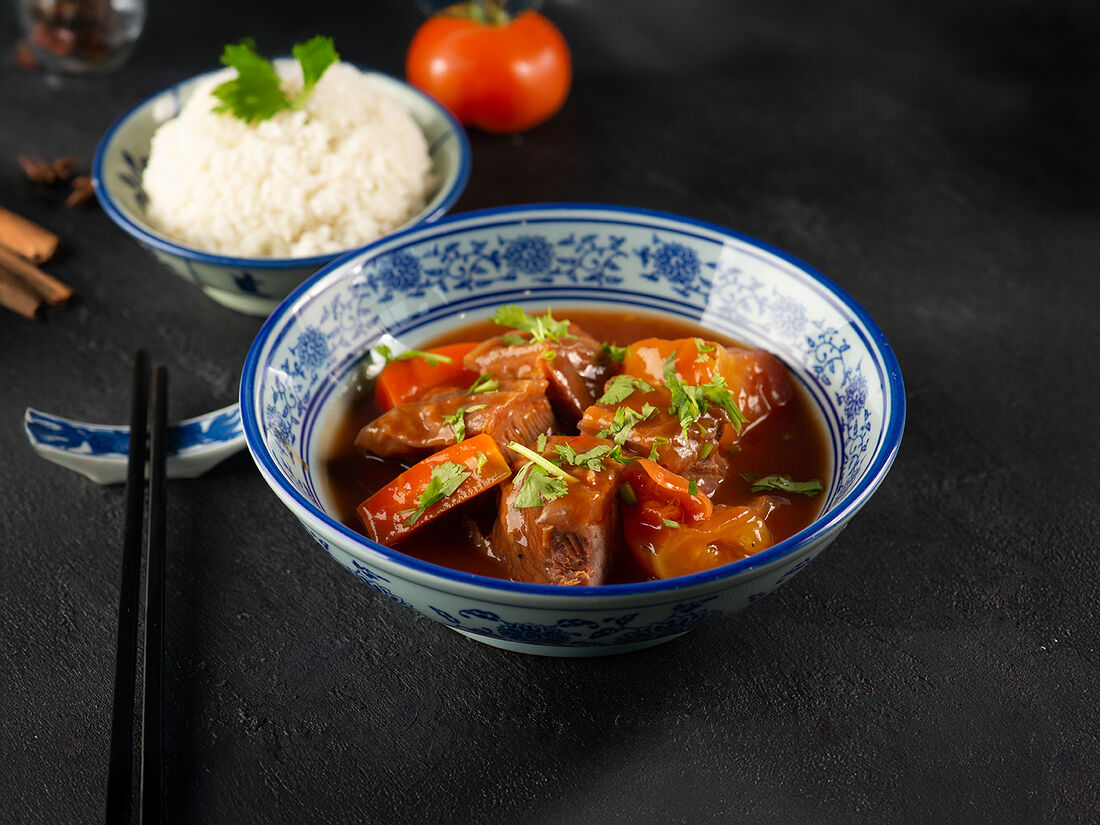 Тушеная свиная рулька в соевом соусе с рисом