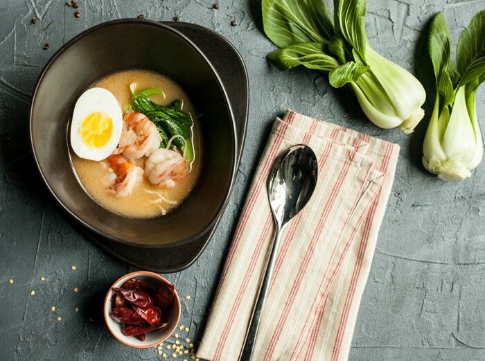 Сингапурский суп с яичной лапшой, креветками, капустой бок-чой и яйцом