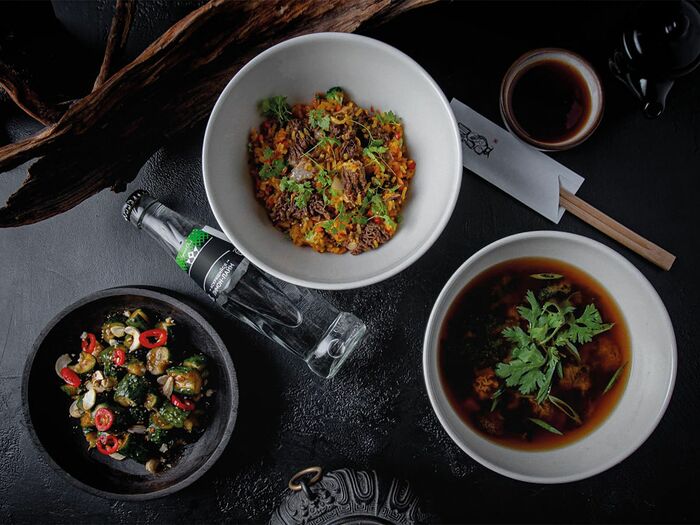 Жареный рис с мраморной говядиной и хрустящими овощами