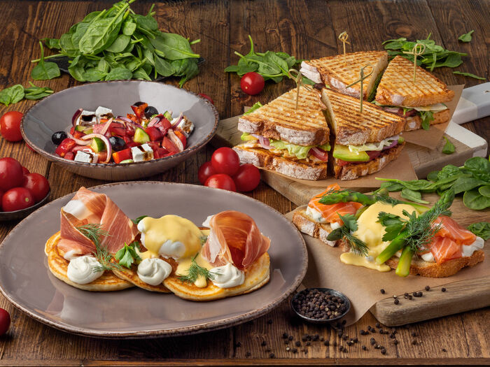 Глазунья с беконом, миксом зелени и Голландским соусом