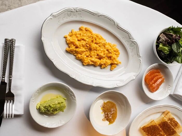 Два яйца пашот, эспума из пармезана и красная икра