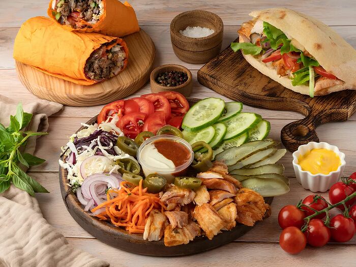 Курица гриль в лаваше с овощами и соусами