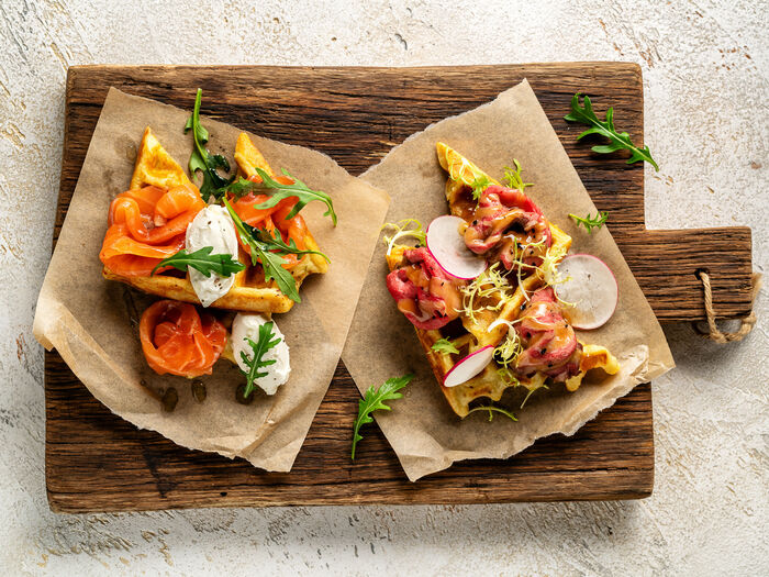 Драники, яйцо пашот, авокадо и лосось