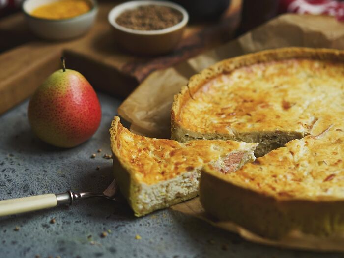 Киш с лососем, грушей, луком-пореем и карри