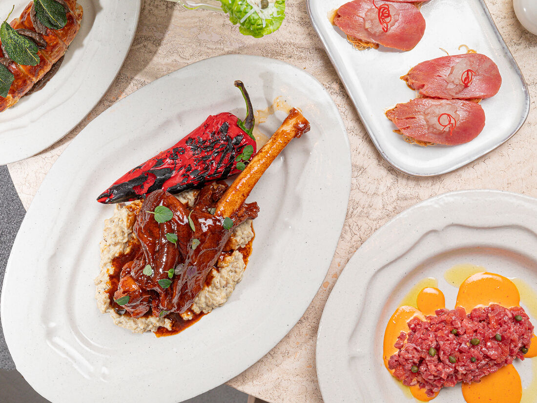 Бульон из ягненка, томленая лопатка ягненка, овощи с костра