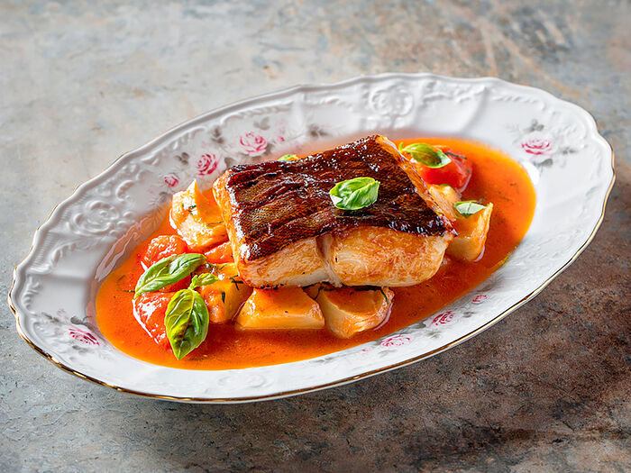Чёрная треска с перцем рамиро и оливками