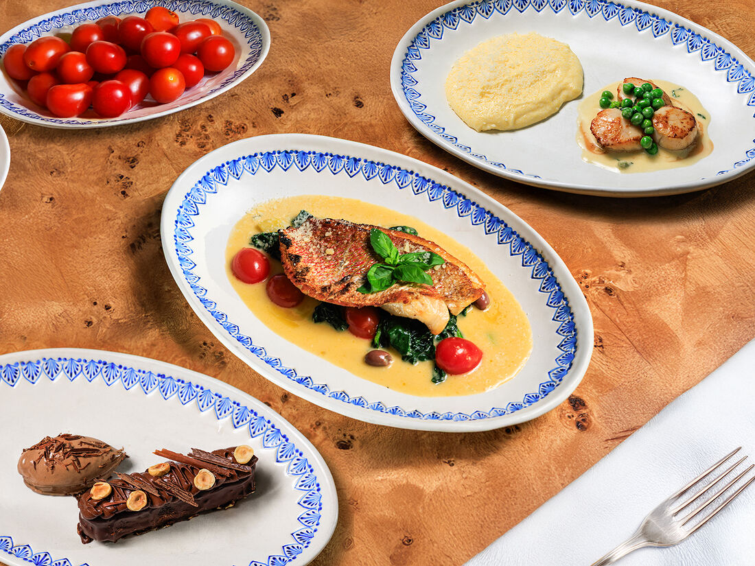Луциан, картофель, шпинат, томаты