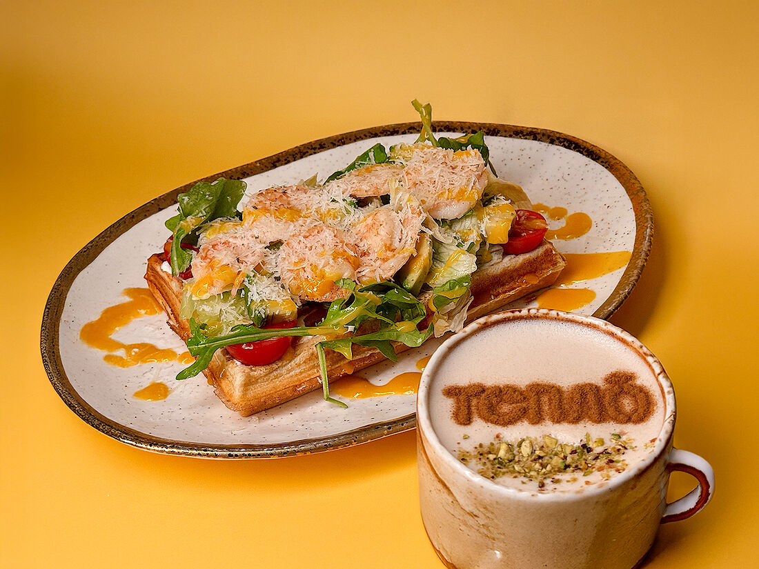 Вафля с чилийскими креветками, авокадо и манго-соусом