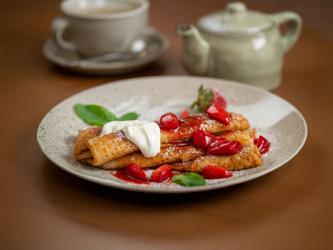 Блины карамелизированные с клубникой и сметаной